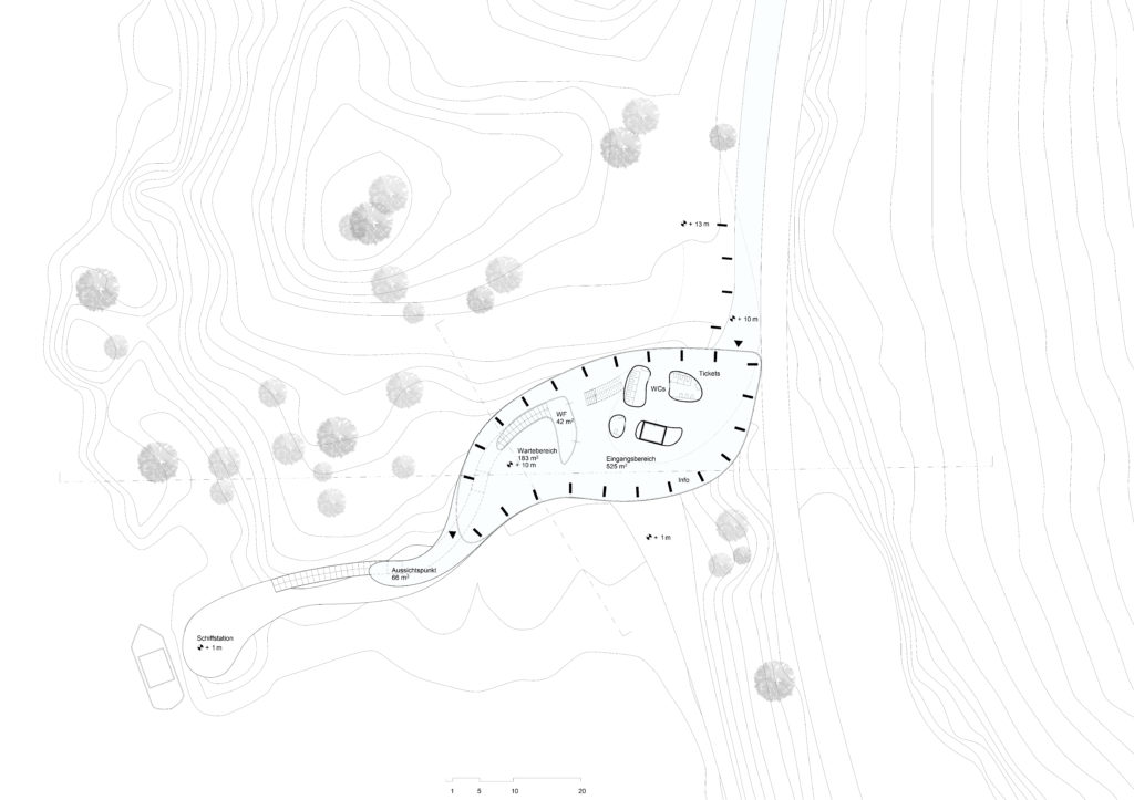 Aufgrund der prägnanten topographischen Verhältnisse am Bauplatz wird das Programm auf die wichtigsten 3 Höhenebenen verteilt.