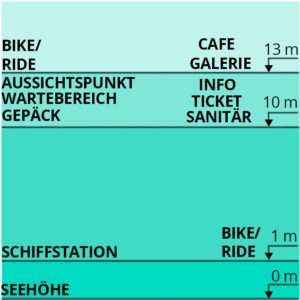 Als zentrales Entwurfselement bietet eine lange, 2m breite Treppe mit flachen, langen Stufen die Verbindung zwischen der Schiffstation und der Ebene +10 m. Sie folgt dem Bewegungsfluss und inszeniert zusätzlich das zentrale Thema der Bewegung.
