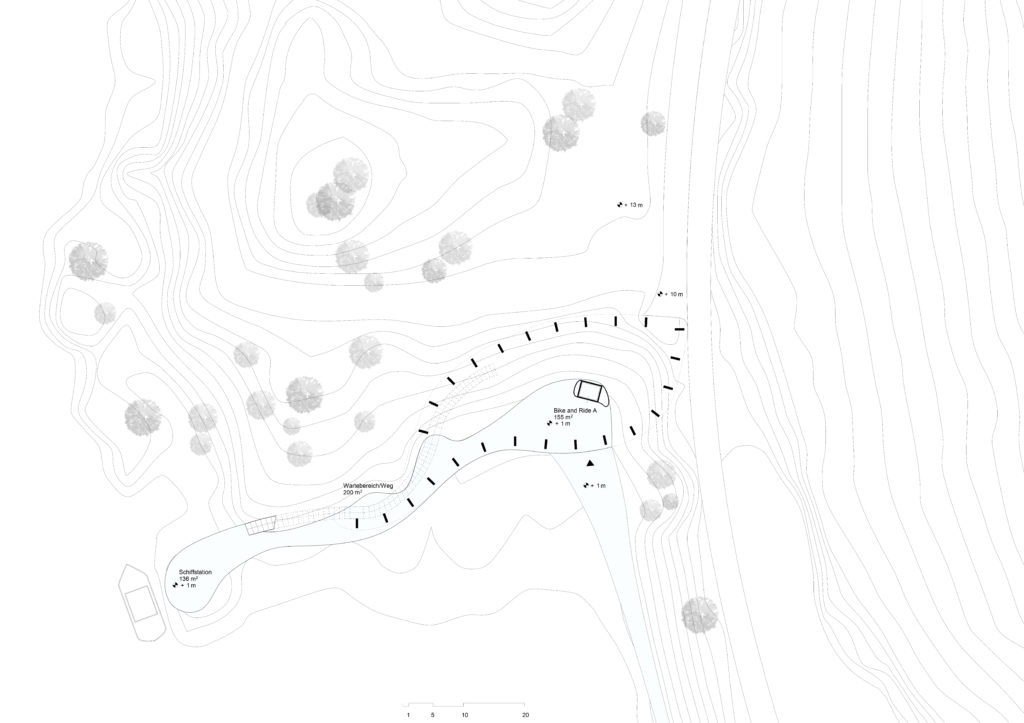 Hier befindet sich eine Bike and Ride Station für die vom Radweg ankommenden Fahrradfahrer, die mit dem Lift bis zur Ebene +13 barrierefrei gelangen können, um dort ihren Weg fortzuführen. Der Hang bietet Sitzgelegenheiten, außerdem führt diese Ebene bis zur Schiffstation.