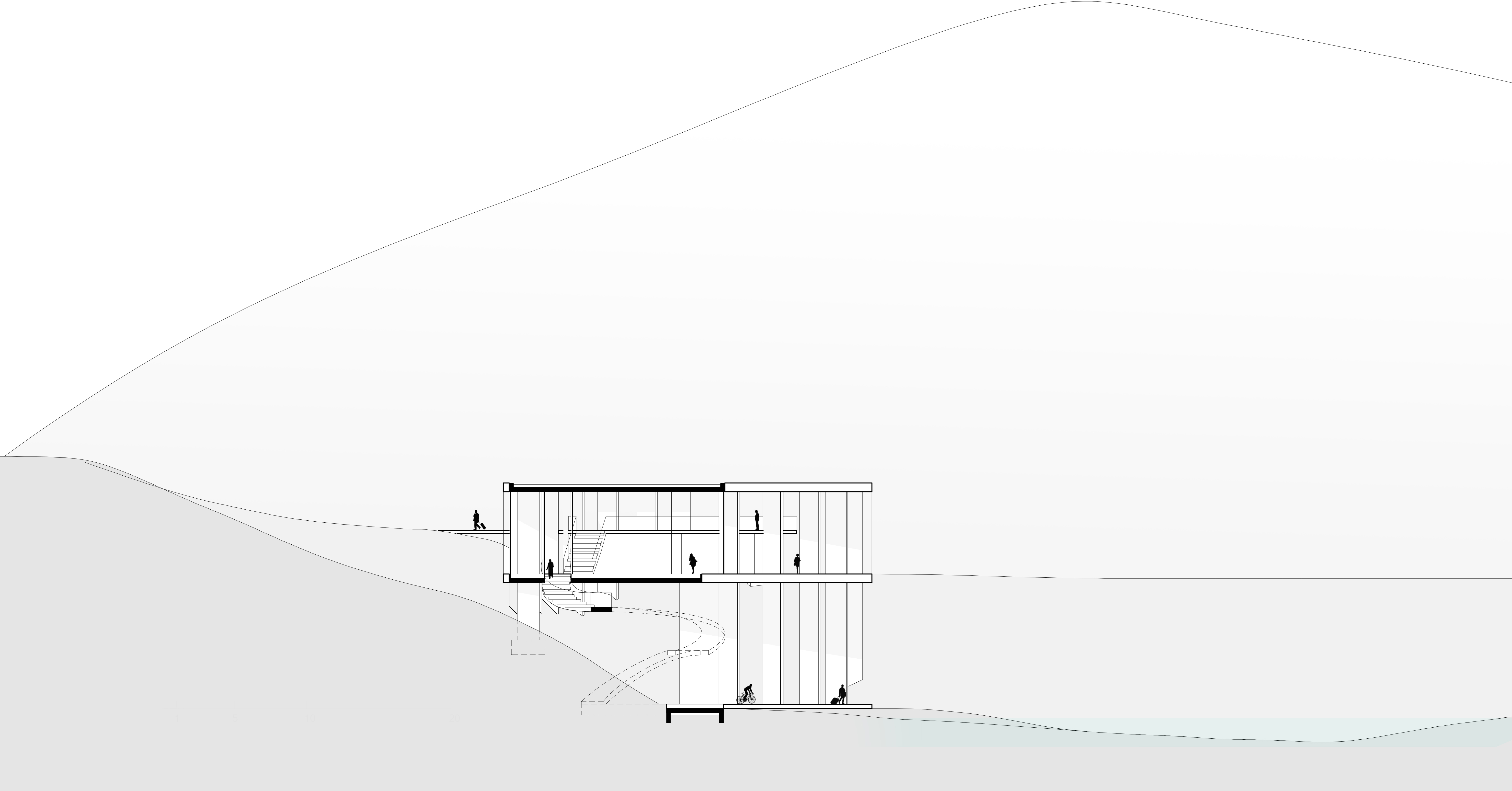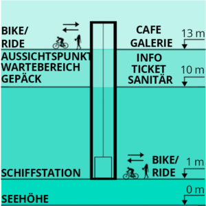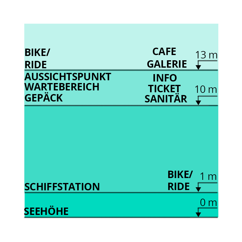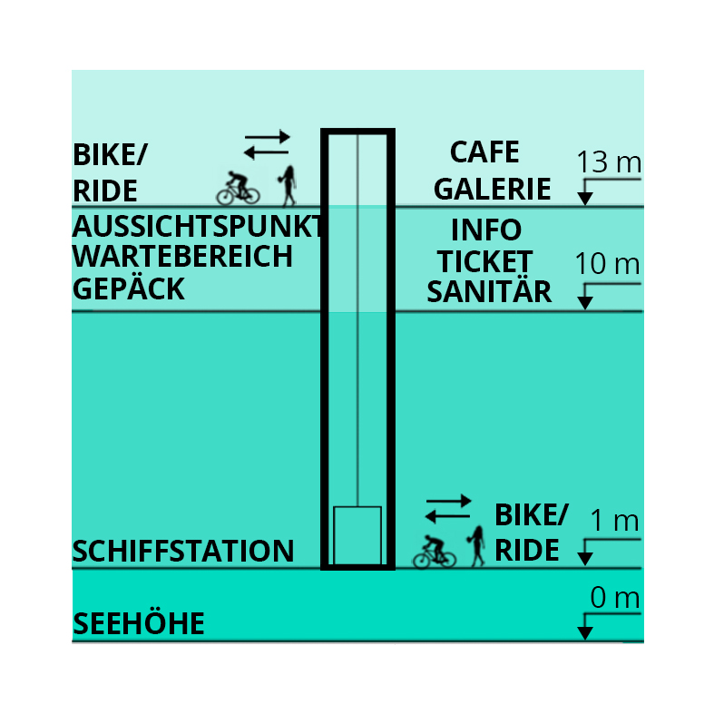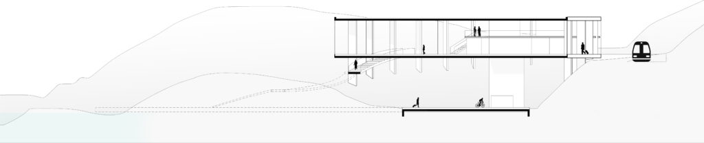 Durch einen zentralen Aufzug können alle Ebenen barrierefrei erschlossen werden. Gleichzeitig dient der Lift als Bindeglied für die Fußgänger- und Radwege, wo Wanderer ohne den Bahnhof durchqueren zu müssen, ihren Weg fortführen können.