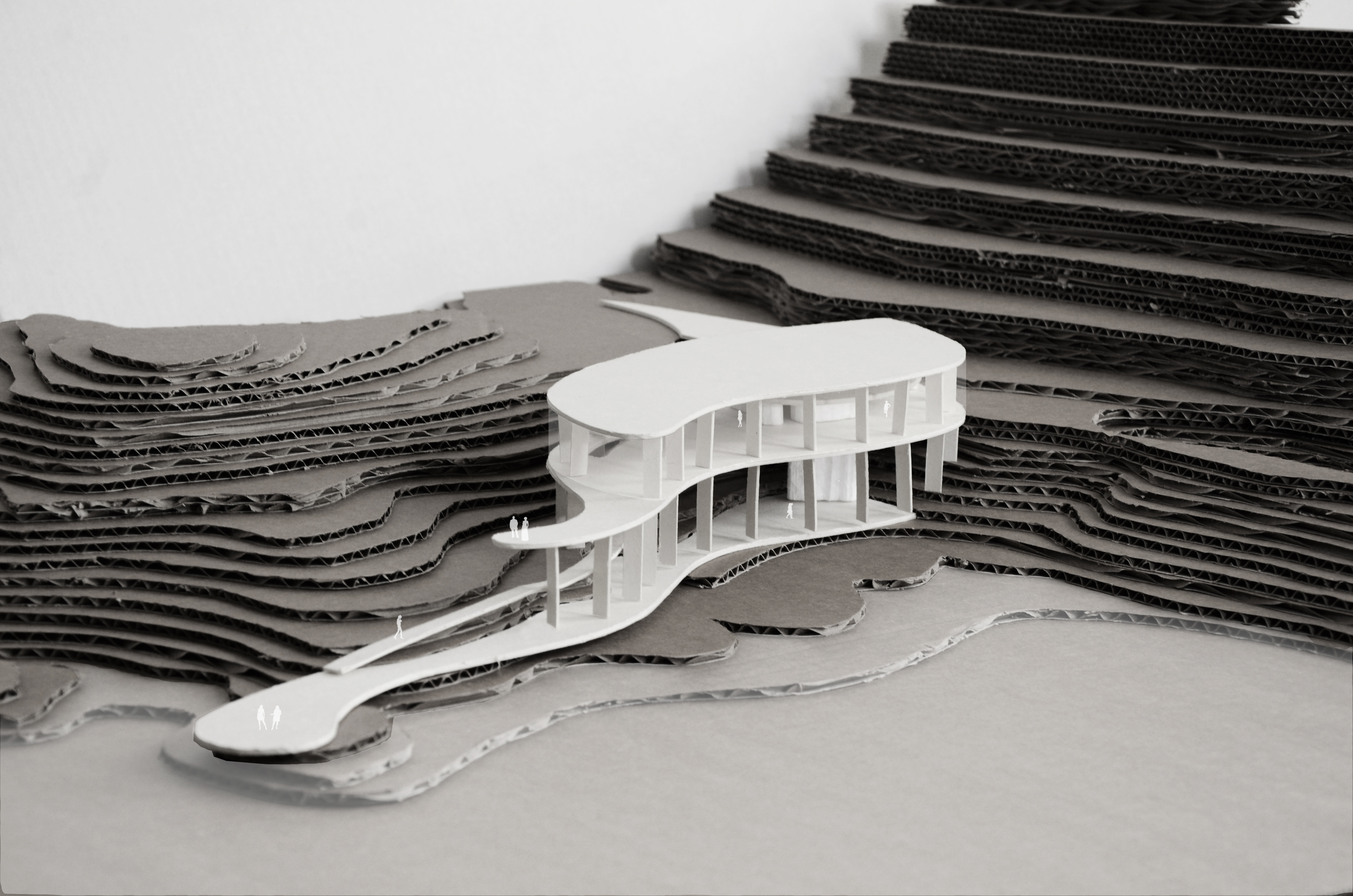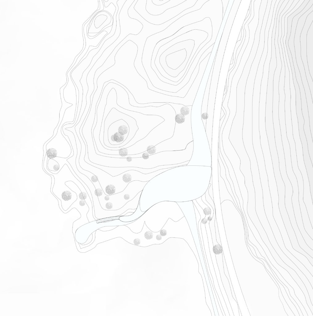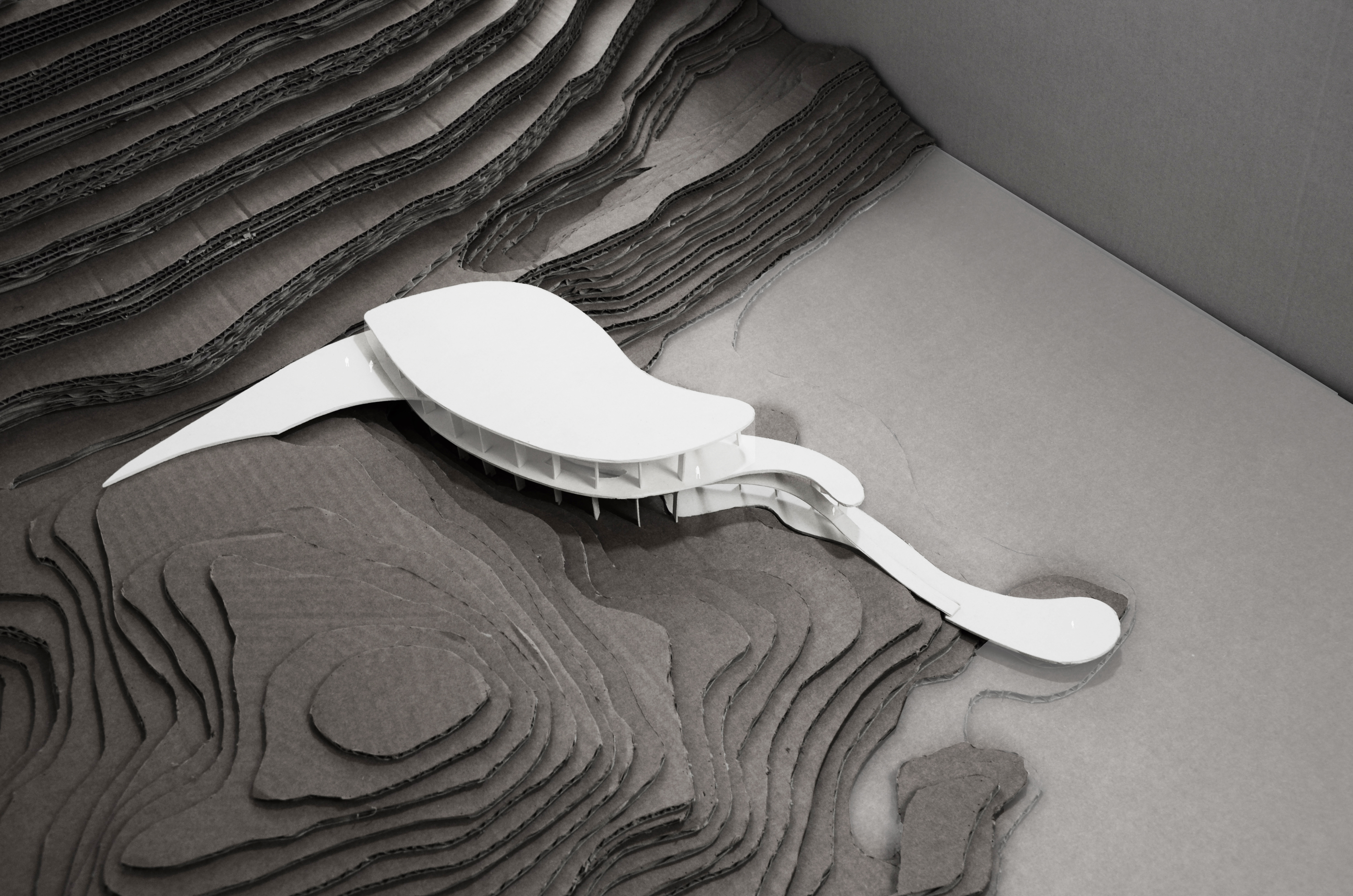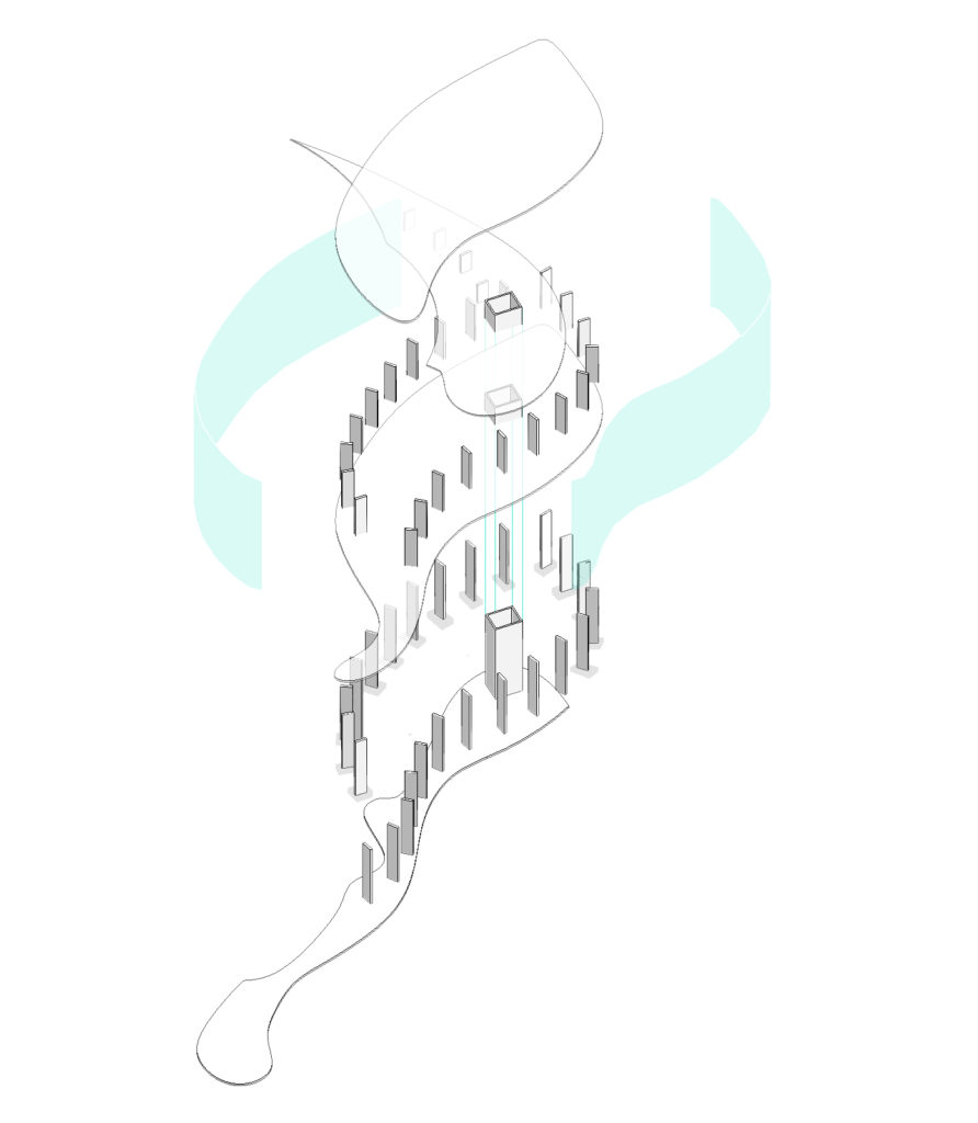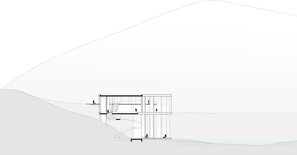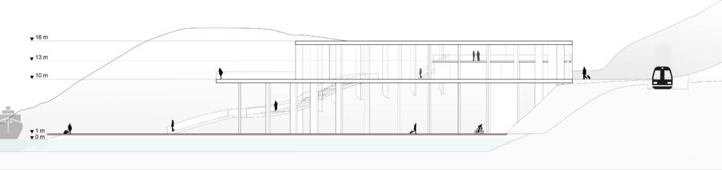 In dem Projekt werden die verschiedenen Mobilitätsfunktionen barrierefrei und effizient verbunden, während die Hangsituation nahezu unangetastet bleibt und das Gebäude formal mit den natürlichen Gegebenheiten verschmilzt. Die organische Form gründet auf den Bewegungsflüssen der Menschen sowie der gegebenen Topographie. Die breiten Stützen inszenieren den Weg vom Bahnhof bis zur offenen Schiffstation, indem sie immer mehr das Panorama von Hallstatt offenbaren.
