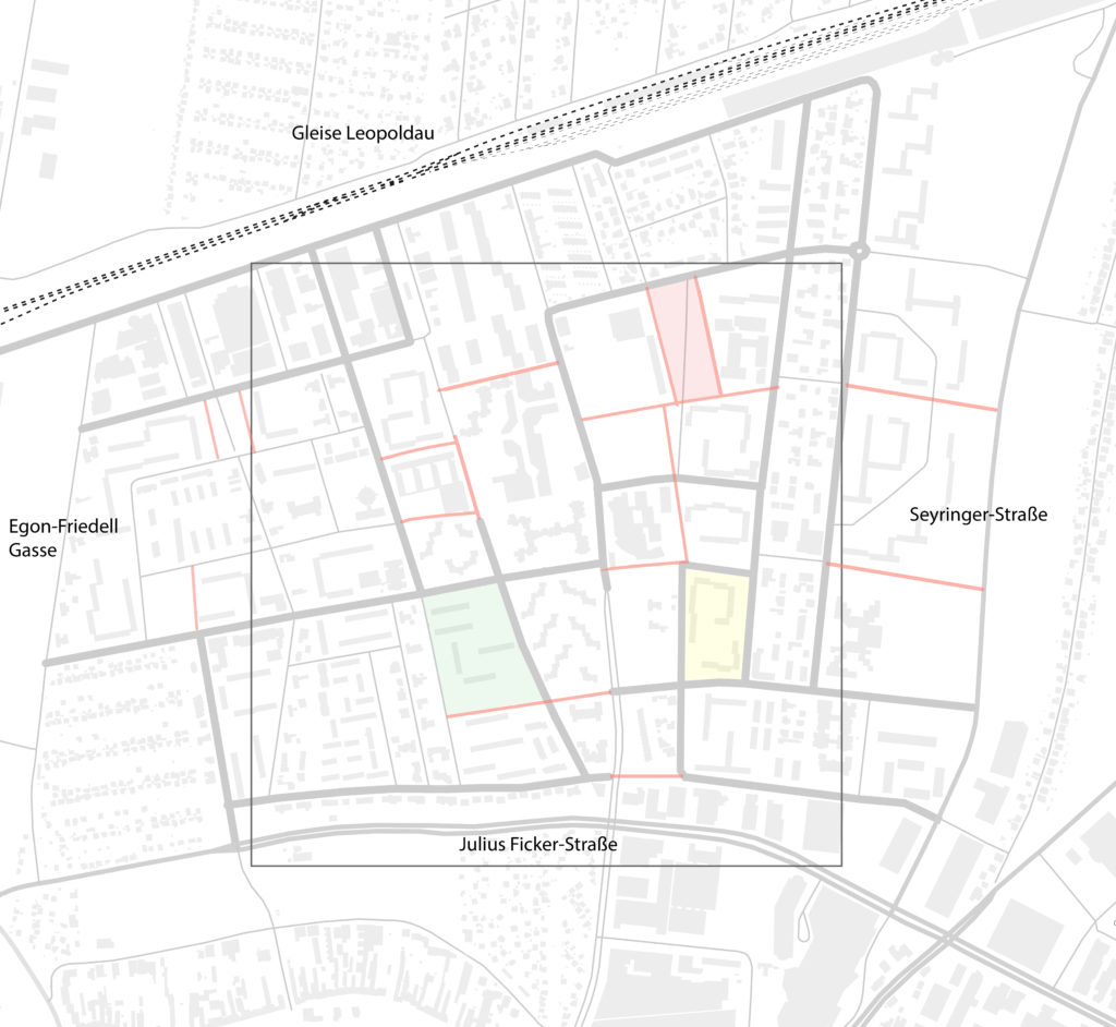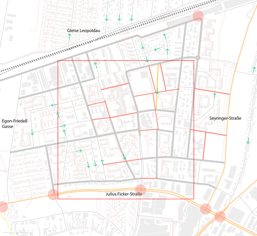 Die quartiersweite Anlegung von Shared Spaces (rot) verbessert die Vernetztheit im Quartier. Nur eine Straße (gelb) muss zugunsten der neuen Wege entfernt werden.
