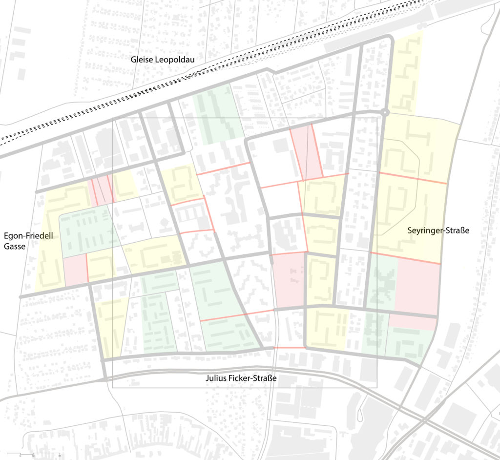 Die Anwendungen des Gesamtkonzeptes wurde im Rahmen der Einzelprojekte für jede Kategorie anhand eines konkreten Baufeldes ausgearbeitet. (rot = Typ A, gelb = Typ B, grün = Typ C)