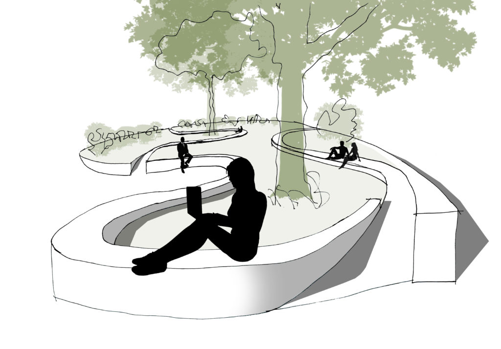 Beispiel für eine organische Form des Landschaftskonzeptes: Durch Bäume verschattete Sitzgelegenheiten auf Holzstegen laden zum Verweilen ein.