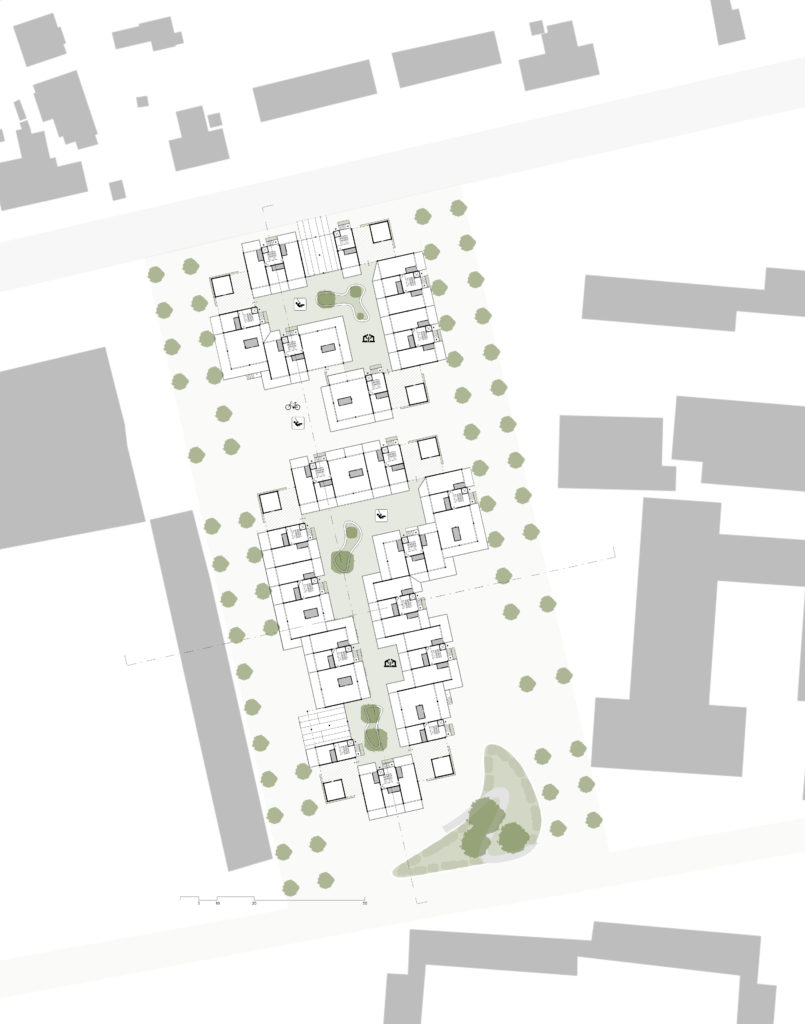 Das Projekt basiert auf der modularen Anordnung der Erschließung und der Wohnungen auf einem 5m x 5m Raster. Diese Module können auf den freien Baufeldern passend zur jeweiligen Situation angeordnet werden. Die EG Zone wird erhöht, wodurch mehr Privatheit für die Wohnungen entsteht, sowie Blickbeziehungen der Passanten mit dem multifunktionalem Kellergeschoss entstehen. Durchlaufende Balkonstreifen und die Skelettstruktur ermöglichen flexible Grundrisse.