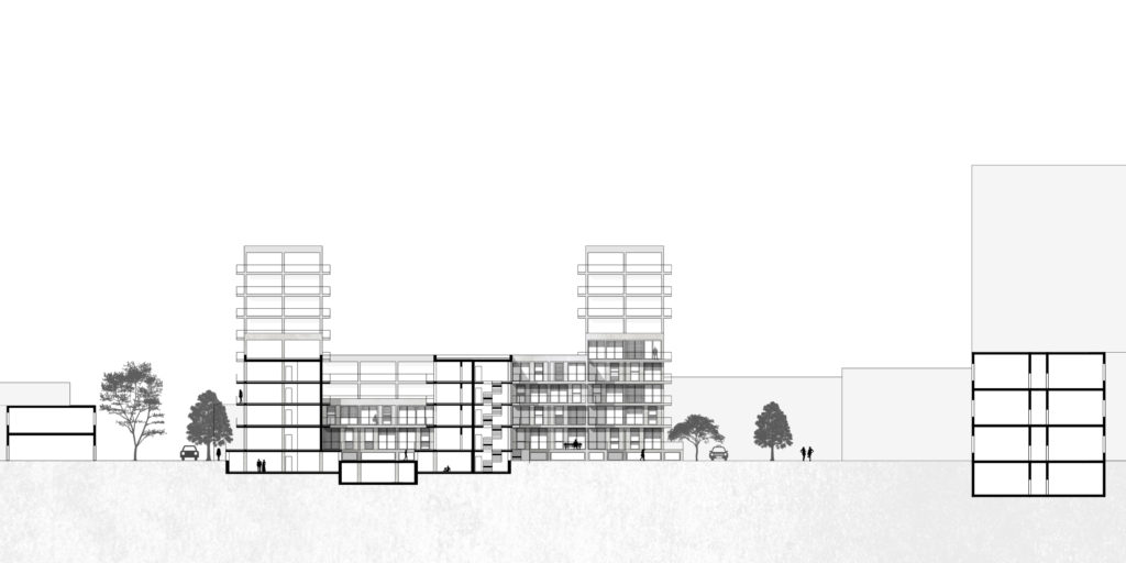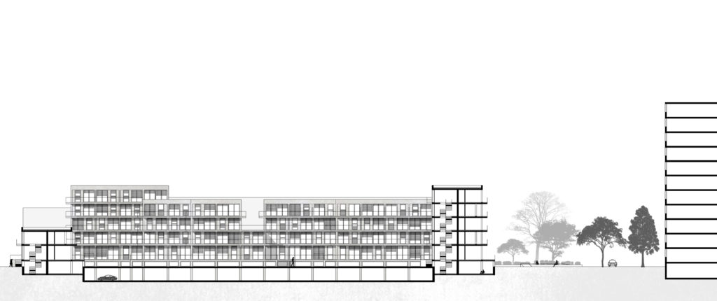 Schnitt B: Die EG Zone wird erhöht, wodurch mehr Privatheit für die Wohnungen entsteht, sowie Blickbeziehungen der Passanten mit dem multifunktionalem Kellergeschoss entstehen.