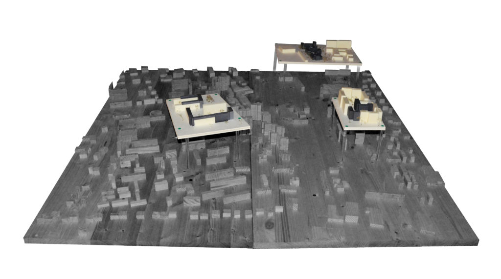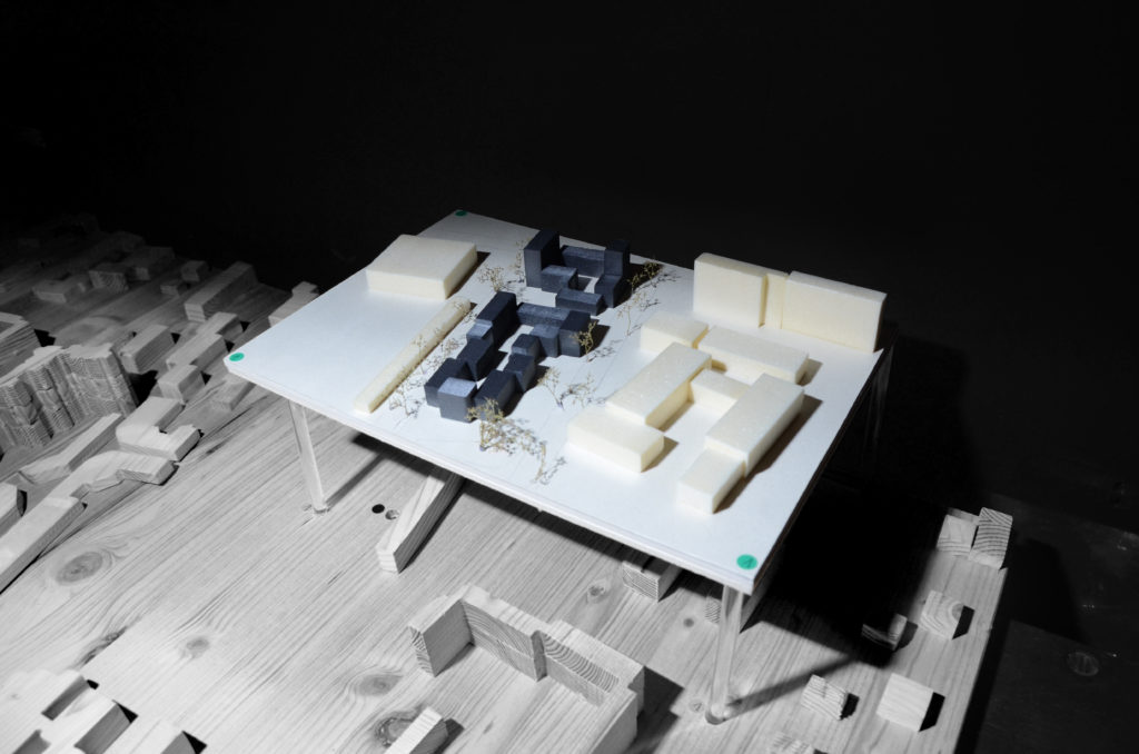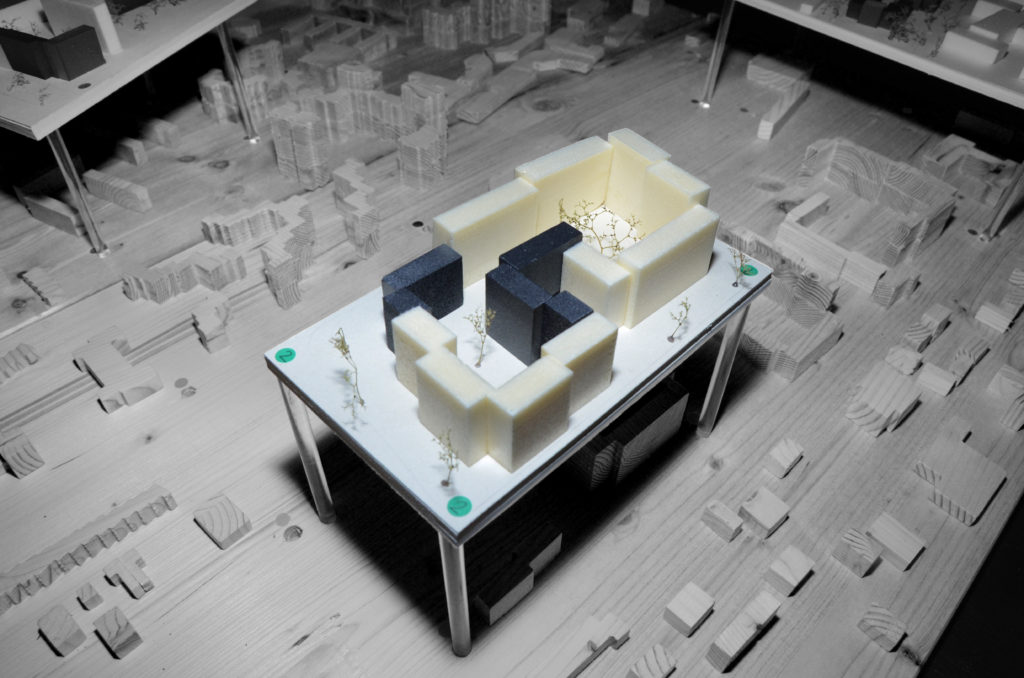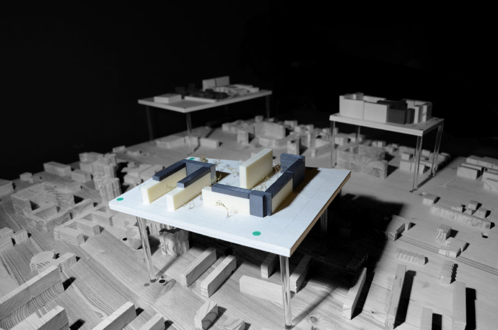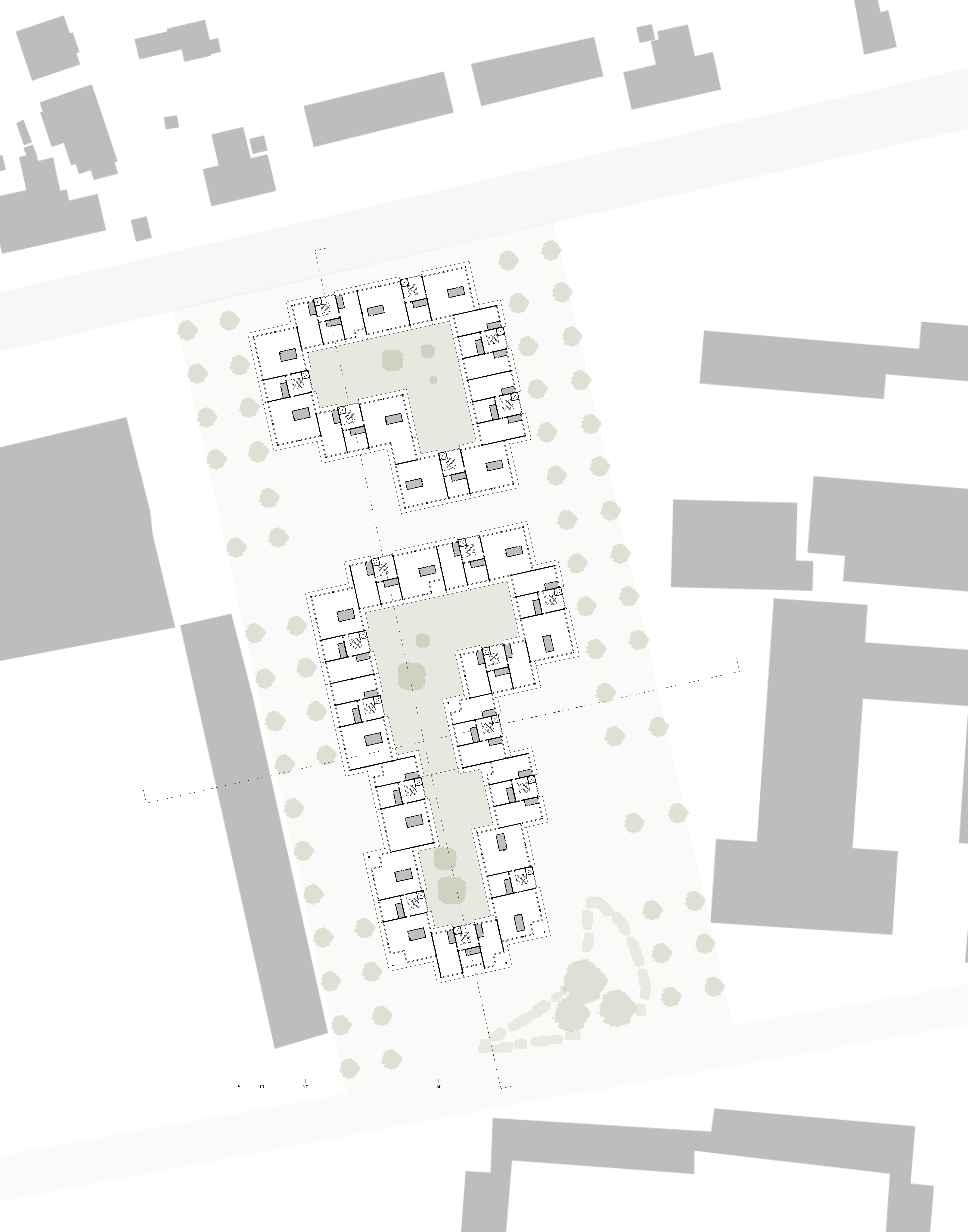 Das Projekt basiert auf der modularen Anordnung der Erschließung und der Wohnungen auf einem 5m x 5m Raster. Diese Module können auf den freien Baufeldern passend zur jeweiligen Situation angeordnet werden. Die EG Zone wird erhöht, wodurch mehr Privatheit für die Wohnungen entsteht, sowie Blickbeziehungen der Passanten mit dem multifunktionalem Kellergeschoss entstehen. Durchlaufende Balkonstreifen und die Skelettstruktur ermöglichen flexible Grundrisse.