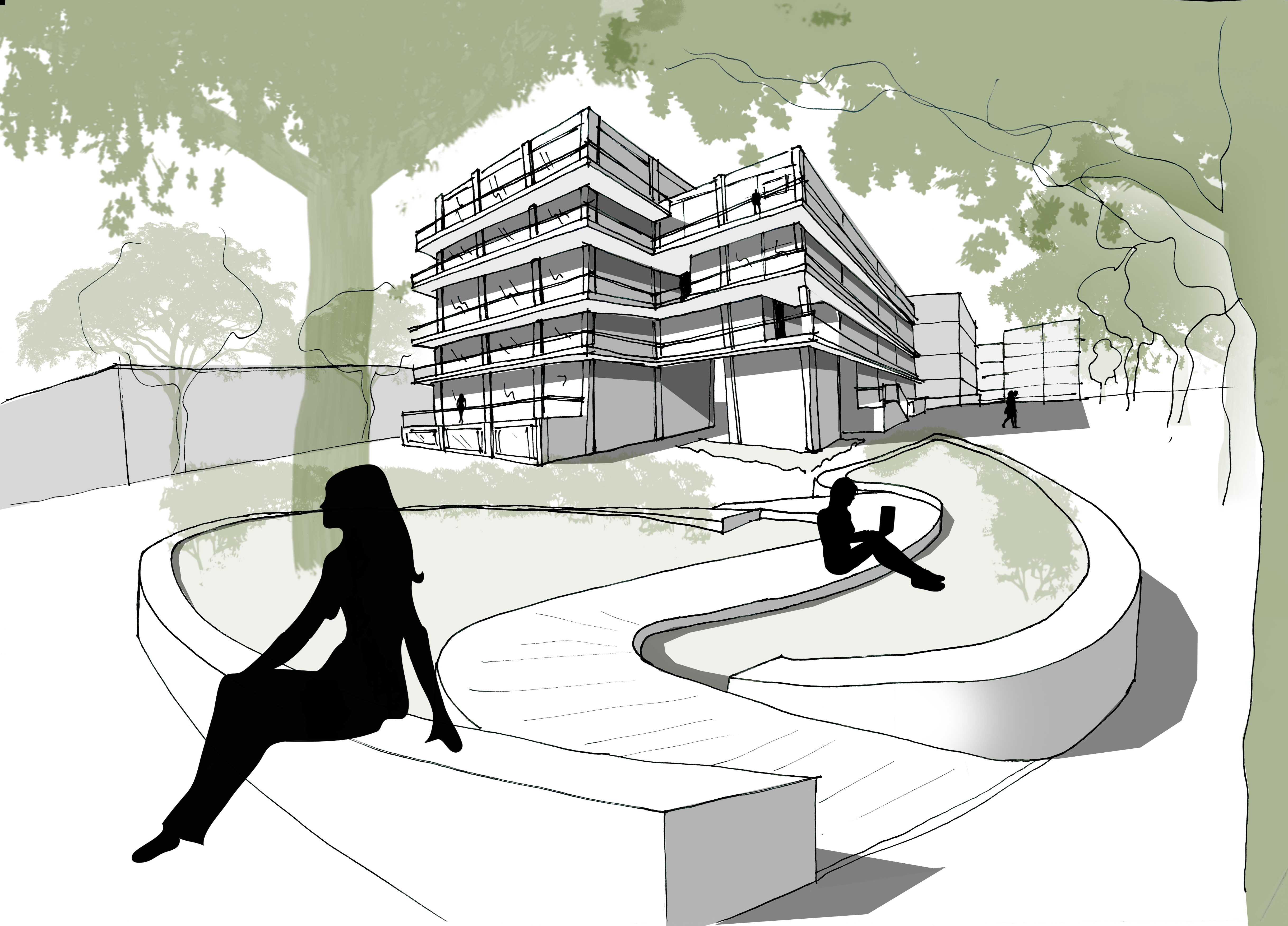 Die Landschaftskonzepte der Einzelprojekte basieren auf den neu entstehenden Shared Spaces im Quartier. Als Grundidee für die weiteren Ausarbeitungen dienen organische Formen, welche auf die Bewegungsflüsse der Menschen reagieren (a), Grünflächen beinhalten (b), sowie Nischen schaffen (c), die für eine bessere Aufenthaltsqualität sorgen. Dabei wird stets auf die Trennung zwischen öffentlichen und privaten Freiräumen geachtet.