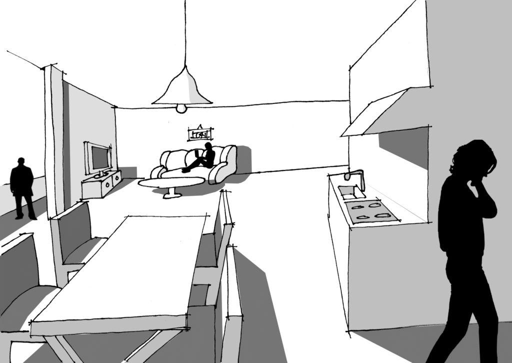 Schnitt B: Die EG Zone wird erhöht, wodurch mehr Privatheit für die Wohnungen entsteht, sowie Blickbeziehungen der Passanten mit dem multifunktionalem Kellergeschoss entstehen.